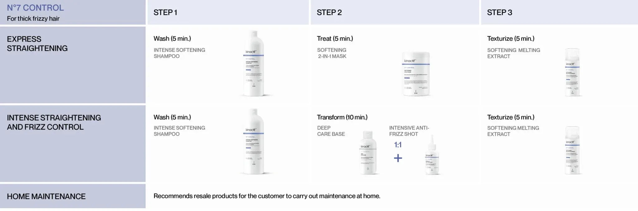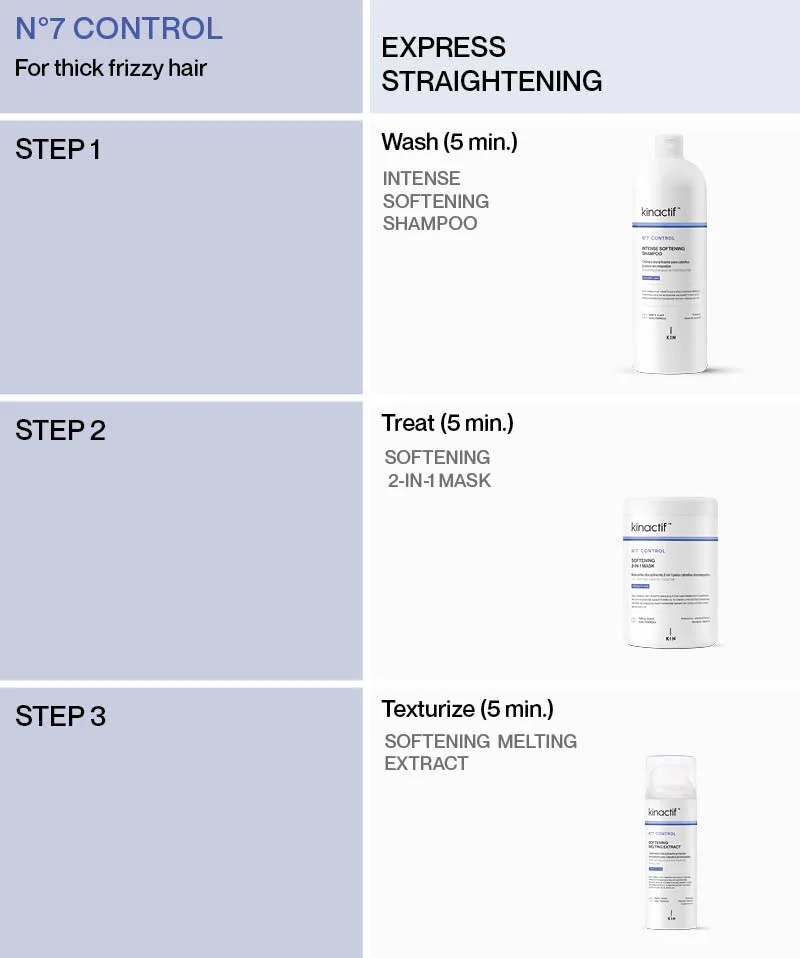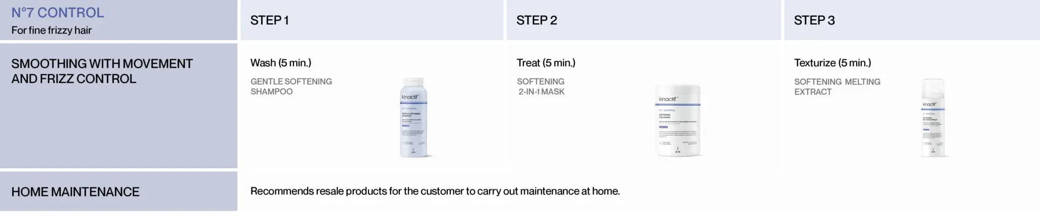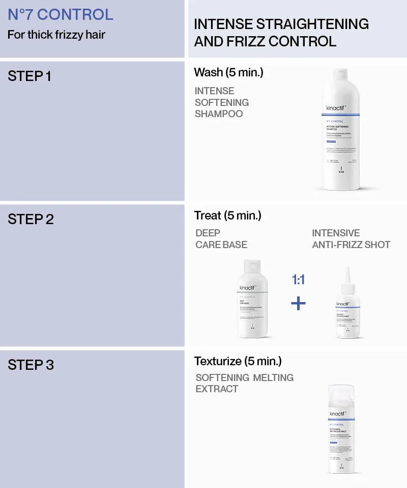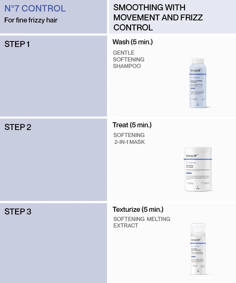 KINACTIF™ N°7 CONTROL fights against frizz on all types of frizzy hair, whether straight or curly. Formulas include ingredients that help control frizz, leaving hair defined, shiny and smooth.