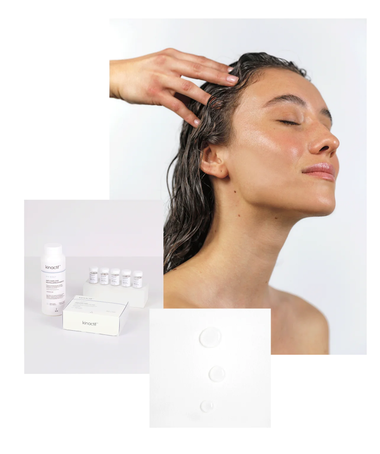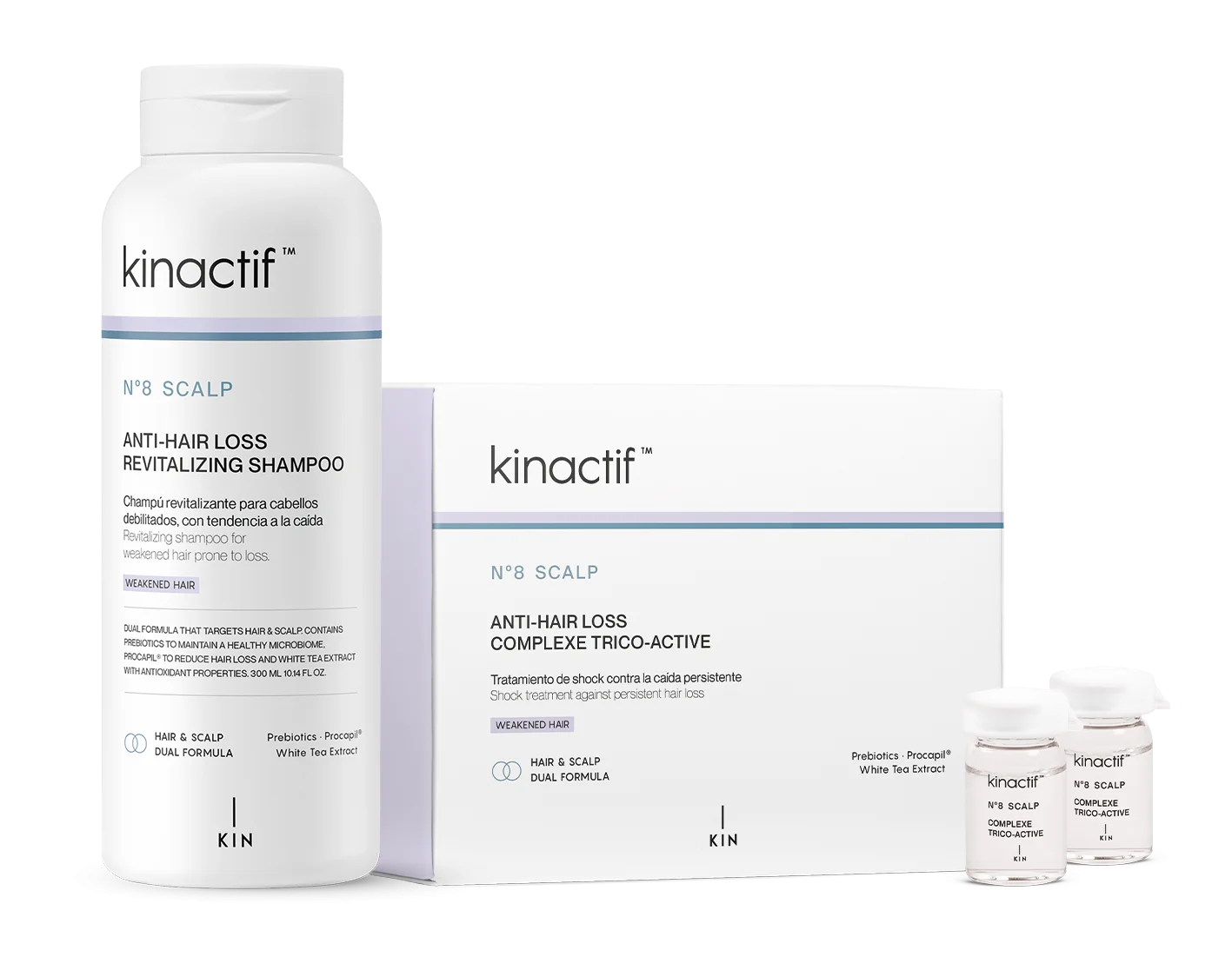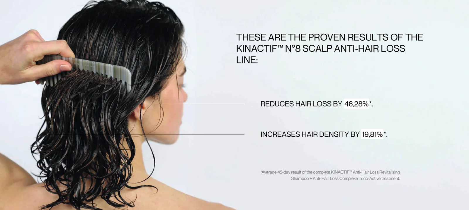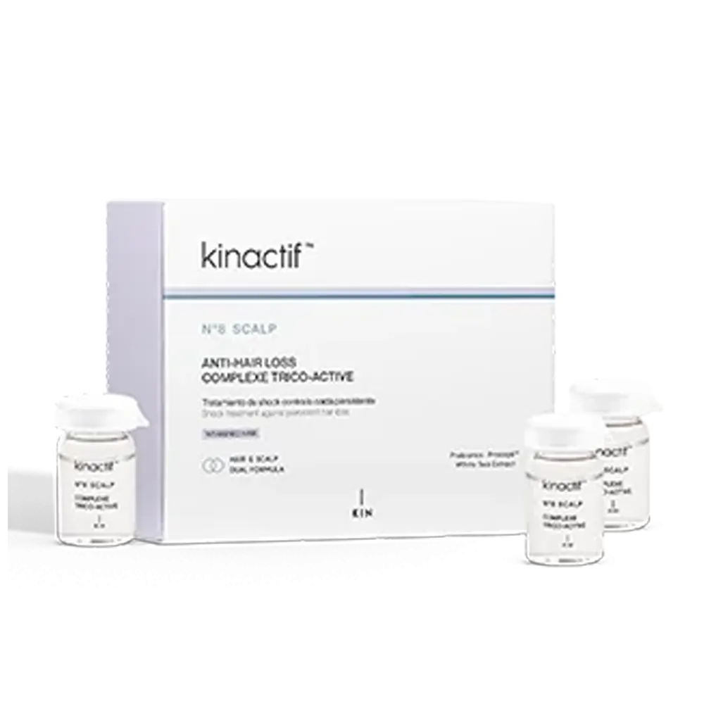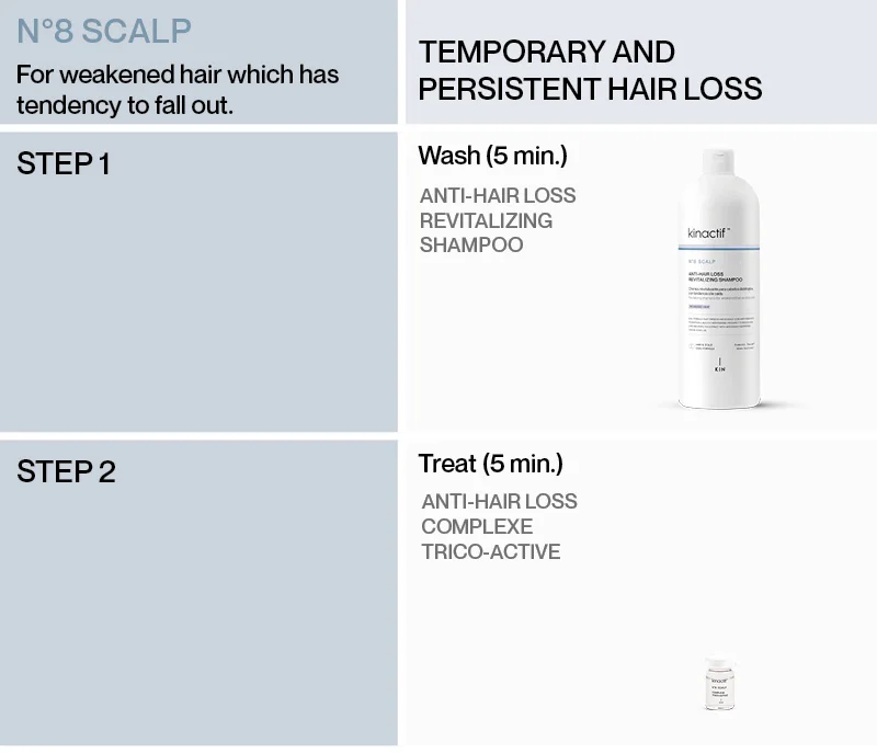 KINACTIF™ N°8 SCALP ANTI-HAIR LOSS products act on weakened hair, reducing hair loss, increasing hair density and strengthening the hair.