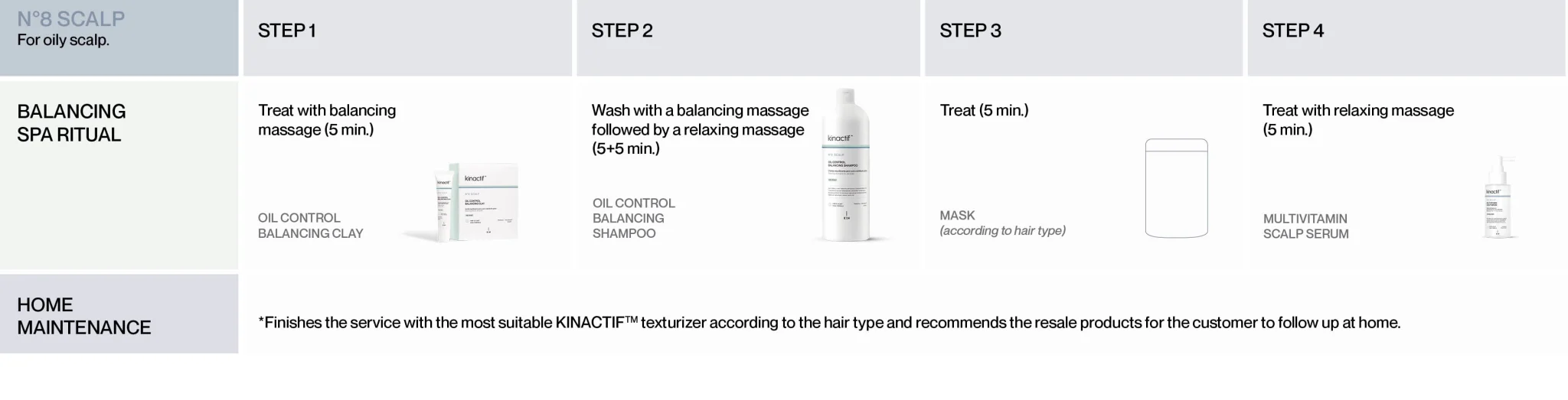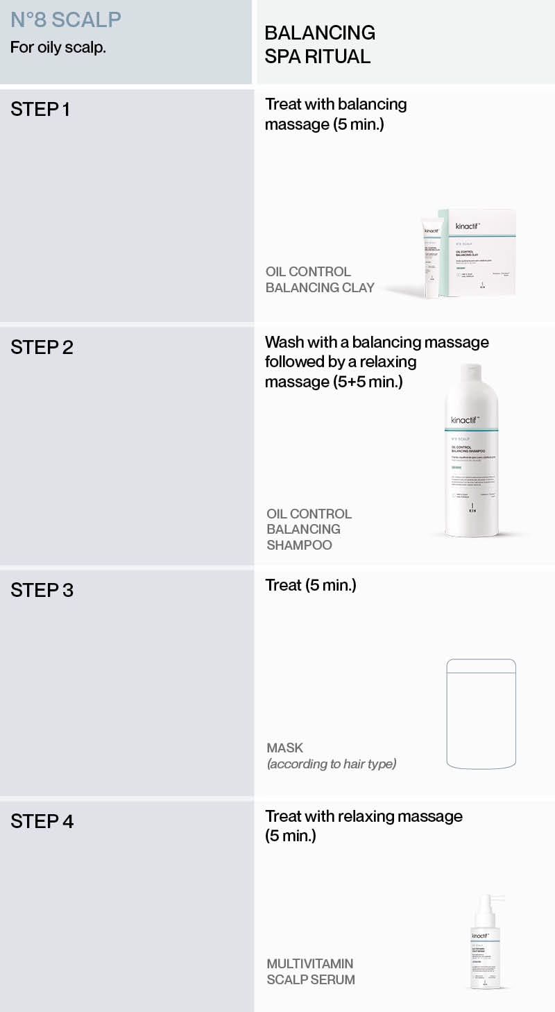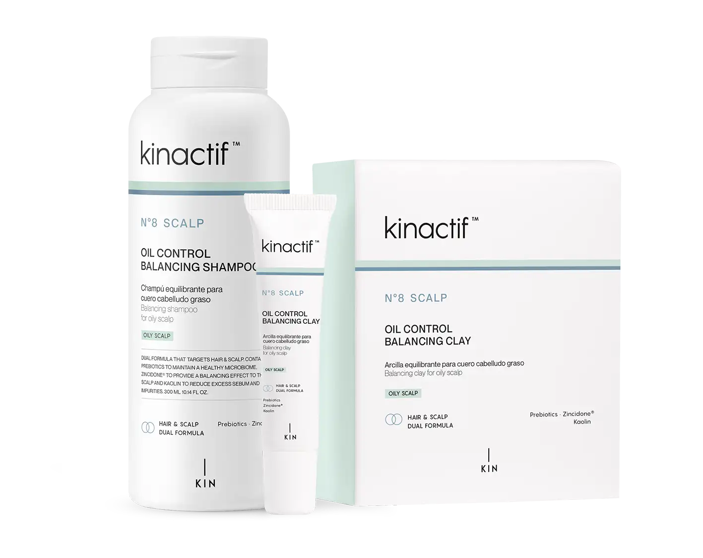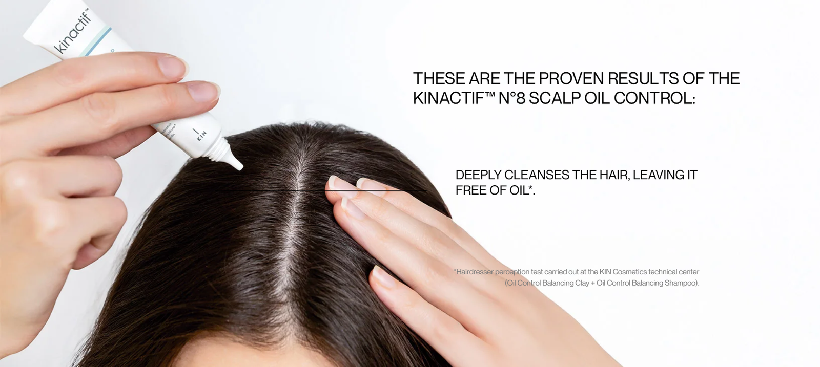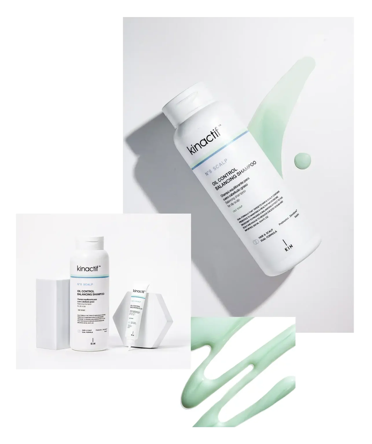 KINACTIF™ N°8 SCALP OIL CONTROL products are specially formulated to regulate sebum production, balancing the scalp, leaving it fresh and revitalized.