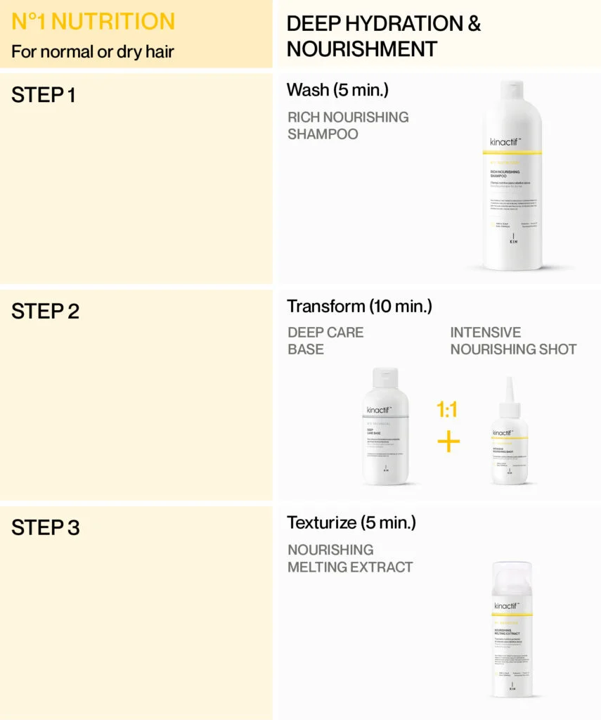 KINACTIF™ N°1 NUTRITION is ideal for this hair type due to its deeply moisturizing and nourishing formulas, leaving it softer, shinier and frizz-free.